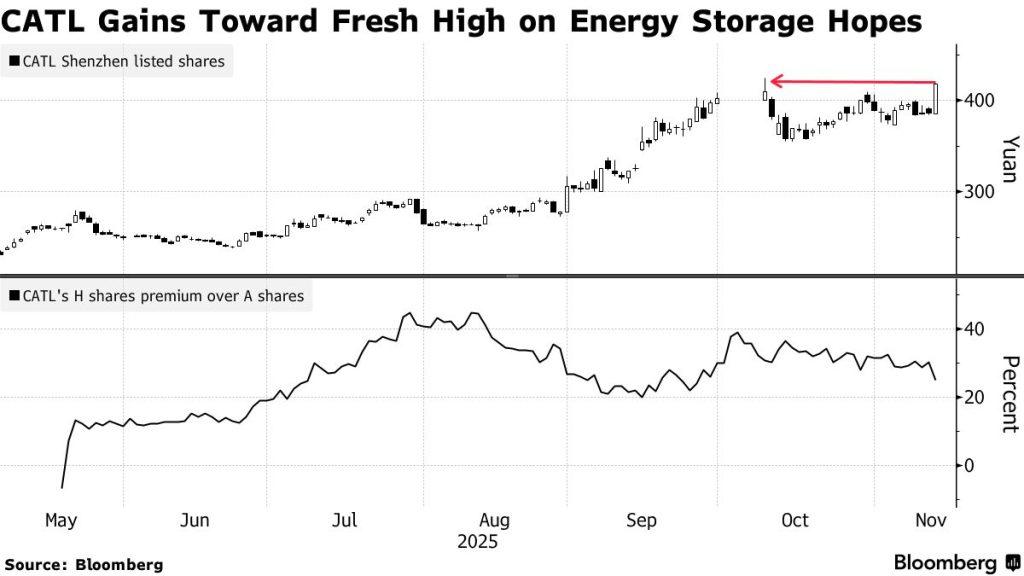 Η CATL σημείωσε άνοδο έως και 8,4% στο Σενζέν την Πέμπτη, σε πορεία για κλείσιμο ρεκόρ, μετά την ανακοίνωση της Beijing Hyperstrong Technology Co. ότι είχε εξασφαλίσει μια παραγγελία 200 γιγαβάτ ωρών μπαταριών συστημάτων αποθήκευσης ενέργειας από την εταιρεία. Η CATL σημείωσε άνοδο 5,8% στο Χονγκ Κονγκ, ενώ η Hyperstrong σημείωσε άνοδο 8,8% στη Σαγκάη, στα υψηλότερα επίπεδα της συνεδρίασης.