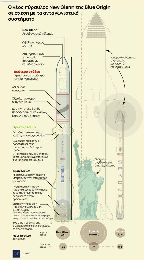 Η εταιρεία εκτόξευσε τον πύραυλο 98 μέτρων που ονομάζεται New Glenn από τον Διαστημικό Σταθμό Cape Canaveral της Φλόριντα στις 10.55 μ.μ. την Πέμπτη (ώρα Ελλάδος), αρκετούς μήνες αργότερα από το προγραμματισμένο και σχεδόν ένα χρόνο αφότου η Blue Origin πραγματοποίησε την εναρκτήρια πτήση της.