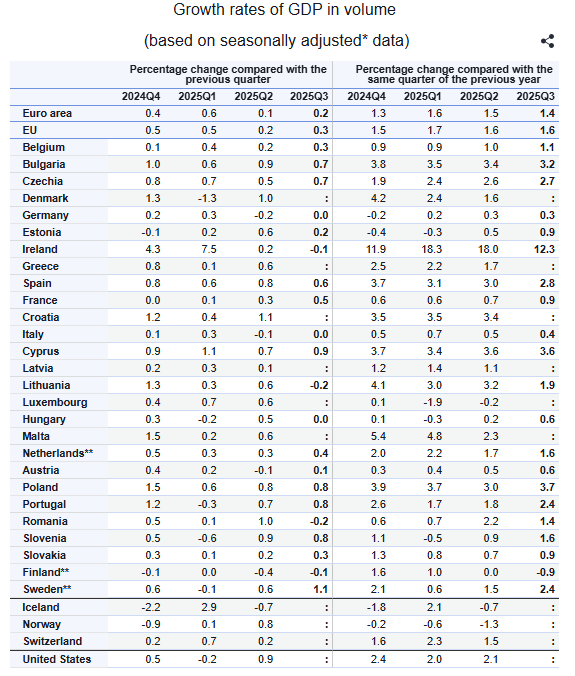 Με ετήσιο ρυθμό 1,4% και τριμηνιαίο 0,2% αναπτύχθηκε η οικονομία της Ευρωζώνης το γ’ τρίμηνο, σύμφωνα με στοιχεία που ανακοίνωσε η Eurostat. Αξίζει να σημειωθεί ότι για την Ελλάδα, τα στοιχεία για το ΑΕΠ θα ανακοινωθούν από την ΕΛΣΤΑΤ στις 5 Δεκεμβρίου.