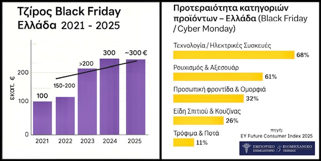 Άλλωστε σύμφωνα με την έρευνα της ΕΥ Ελλάδος σε συνεργασία με την MRB και την Choose Communications, με τίτλο, “EY Future Consumer Index Ελλάδα 2025” η πρόθεση των Ελλήνων καταναλωτών για αγορές την φετινή περίοδο αναμένεται αισθητά αυξημένη σε σχέση με πέρυσι, ιδιαίτερα για την ηλικιακή ομάδα μεταξύ 30-40 ετών που αντικατέστησε στη πρωτιά τους νέους ηλικίας 18-29 ετών.