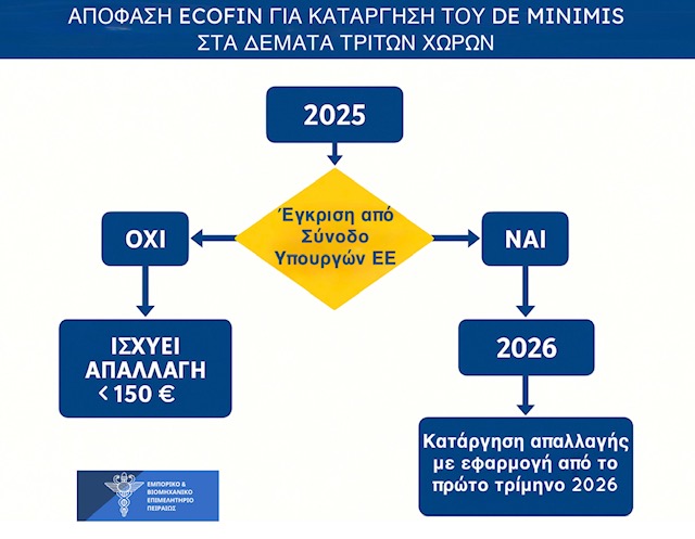 Ως εκ τούτου, μέσω ενός μεταβατικού συστήματος, αναμένεται να εγκριθεί στην προσεχή Σύνοδο Υπουργών, στις 12 Δεκεμβρίου 2025. Το ΕΒΕΠ θεωρεί απόλυτα ορθή την απόφαση του ECOFIN για κατάργηση του «de minimis» των χρεώσεων μικροδεμάτων τρίτων χωρών αξίας μέχρι 150 ευρώ προς τις χώρες της ΕΕ με εφαρμογή από το πρώτο τρίμηνο του 2026.