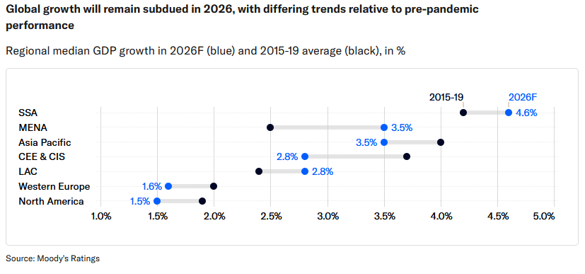 Η κινεζική ανάπτυξη (A1 αρνητικό) αναμένεται να επιβραδυνθεί στο 4,5% το 2026, από περίπου 5% το 2024 και το 2025. Αντίθετα, οι χώρες της Υποσαχάριας Αφρικής αναμένεται να ηγηθούν της παγκόσμιας ανάπτυξης, με τη μέση ανάπτυξη του ΑΕΠ να φτάνει το 4,6% το 2026.