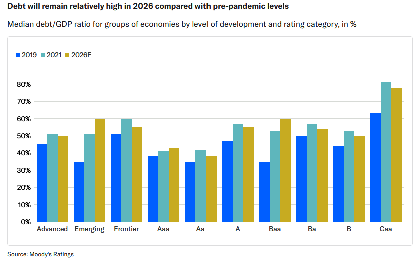 Σύμφωνα με τη Moody’s, η πλειονότητα των κρατών που αναμένει να επιτύχουν τις μεγαλύτερες μειώσεις χρέους το 2026 είναι χώρες με χαμηλούς δείκτες αξιολόγησης, με εξαίρεση την Ελλάδα, η οποία αξιολογείται με Baa3.