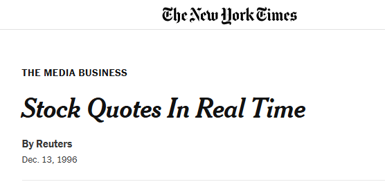 Εκείνη την μέρα (13/12/1996) το Χρηματιστήριο της Νέας Υόρκης άρχισε να μεταδίδει τιμές μετοχών σε πραγματικό χρόνο στα καλωδιακά τηλεοπτικά κανάλια CNNFN και CNBC για προβολή κατά τη διάρκεια των οικονομικών ειδησεογραφικών εκπομπών τους, μας πληροφορεί το Reuters.