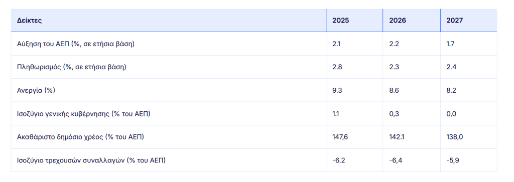 Όπως αναφέρει η Κομισιόν, η οικονομία της Ελλάδας αναμένεται να συνεχίσει να αναπτύσσεται με ισχυρό ρυθμό, με προβλεπόμενη ανάπτυξη 2,1% το 2025 και 2,2% το 2026, υποστηριζόμενη από σταθερή κατανάλωση και επενδύσεις που υποστηρίζονται από κονδύλια της ΕΕ. Η αύξηση του ΑΕΠ προβλέπεται να μετριαστεί στο 1,7% το 2027, καθώς το RRF πλησιάζει στο τέλος του.