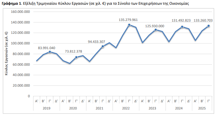 Ειδικότερα, για το σύνολο των επιχειρήσεων και των δραστηριοτήτων της οικονομίας, ο κύκλος εργασιών το τρίτο τρίμηνο 2025 ανήλθε σε 133.260.703 χιλ. ευρώ, σημειώνοντας αύξηση 1,3% σε σχέση με το τρίτο τρίμηνο 2024, που είχε ανέλθει σε 131.492.823 χιλ. ευρώ (Γράφημα 1, Πίνακας 1).