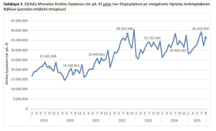 Για το σύνολο των επιχειρήσεων της οικονομίας με υποχρέωση τήρησης διπλογραφικών βιβλίων, για τις οποίες υπάρχουν διαθέσιμα στοιχεία σε μηνιαία βάση, ο κύκλος εργασιών τον Σεπτέμβριο 2025 ανήλθε σε 36.410.959 χιλ. ευρώ, σημειώνοντας αύξηση 5,8% σε σχέση με τον Σεπτέμβριο 2024, που είχε ανέλθει 34.403.161 χιλ. ευρώ.