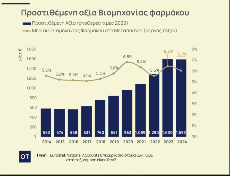Η προστιθέμενη αξία της βιομηχανίας φαρμάκου διαμορφώθηκε σχεδόν στα 1,6 δισ. ευρώ ή στο 6,1% της μεταποίησης το 2024 παραμένοντας αμετάβλητη σε σχέση με ένα έτος νωρίτερα.