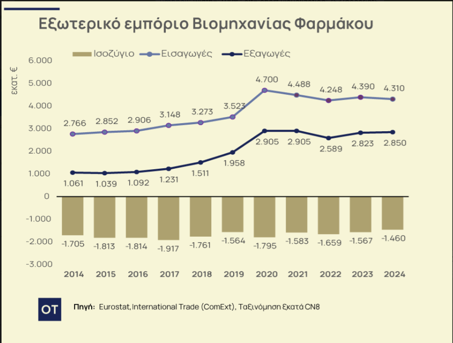 Σύμφωνα με την έκθεση, η αξία παραγωγής της βιομηχανίας φαρμάκου ανήλθε στα 2,4 δισ. ευρώ το 2024, αυξημένη κατά 8,4% σε σχέση με το 2023, οπότε είχε διαμορφωθεί σε 2,2 δισ. ευρώ, και σε υπερδιπλάσια επίπεδα από το 2014, έτος κατά το οποίο είχε αγγίξει τα 941 εκατ. ευρώ.