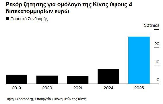 Η ισχυρή ζήτηση των επενδυτών επέτρεψε στην Κίνα να δανειστεί δολάρια ουσιαστικά με το ίδιο κόστος με τις ΗΠΑ, ακολουθούμενη από μια άνευ προηγουμένου ζήτηση για την προσφορά της σε ενιαίο νόμισμα