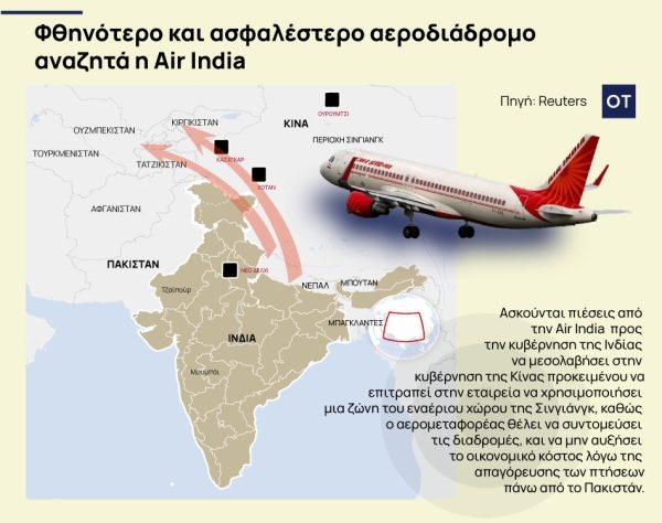Η ινδική κυβέρνηση εξετάζει το αίτημα της Air India να ζητήσει διπλωματικά από την Κίνα να επιτρέψει εναλλακτική διαδρομή και πρόσβαση έκτακτης ανάγκης σε αεροδρόμια σε περίπτωση εκτροπής πτήσεων στο Χοτάν, το Κασγκάρ και το Ουρούμτσι στο Σινγιάνγκ, με στόχο την ταχύτερη πρόσβαση στις ΗΠΑ, τον Καναδά και την Ευρώπη, σύμφωνα με το έγγραφο.