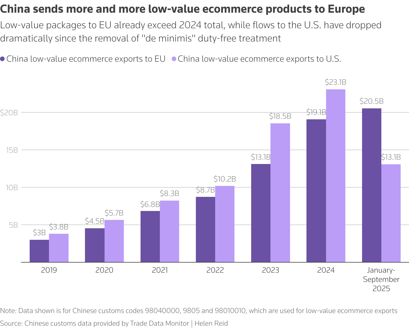 Οι ΗΠΑ κατάργησαν τη δική τους πολιτική «de minimis» που επέτρεπε την αδασμολόγητη είσοδο σε δέματα αξίας κάτω των 800 δολαρίων, οδηγώντας σε ανησυχίες ότι οι φθηνές κινεζικές εισαγωγές θα εκτρέπονταν περισσότερο προς την Ευρώπη .