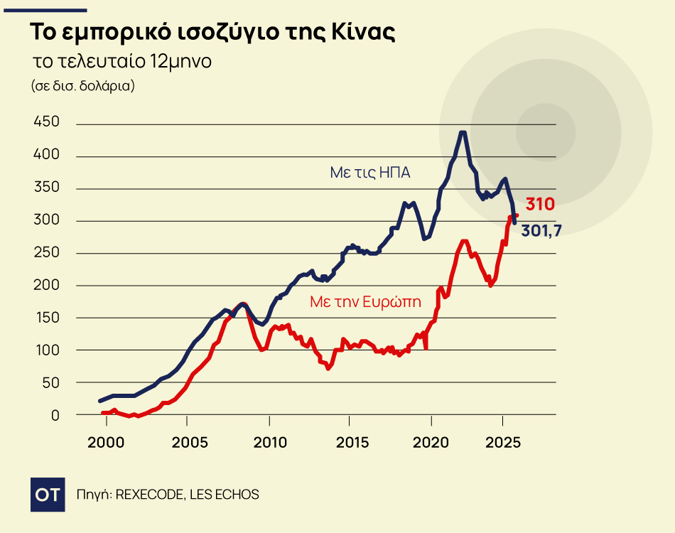 Συγκεκριμένα το διάστημα μεταξύ Οκτωβρίου 2024 και Οκτωβρίου 2025 το πλεόνασμα της Κίνας με την Ευρώπη έφτασε τα 310 δισ. δολάρια, ξεπερνώντας το πλεόνασμα με τις ΗΠΑ που καταγράφτηκε στα 302 δισ. δολάρια. Όπως υπολογίζει ο Αντονί Μορλέ-Λαβινταλί του εδρεύοντος στο Παρίσι Κέντρου Οικονομικών και Επιχειρηματικών Rexecode, από το 2019 το πλεόνασμα της Κίνας με την Ευρώπη έχει σχεδόν διπλασιαστεί. Και όλα δείχνουν ότι με τους δασμούς του Τραμπ, οι οποίοι σε μεγάλο βαθμό κλείνουν την πόρτα της αμερικανικής αγοράς στις κινεζικές εξαγωγές, αυτό το φαινόμενο πρόκειται να ενταθεί περαιτέρω στο μέλλον καθώς οι Κινέζοι εξαγωγείς θα στρέφονται περισσότερο στις εκτός των ΗΠΑ αγορές.