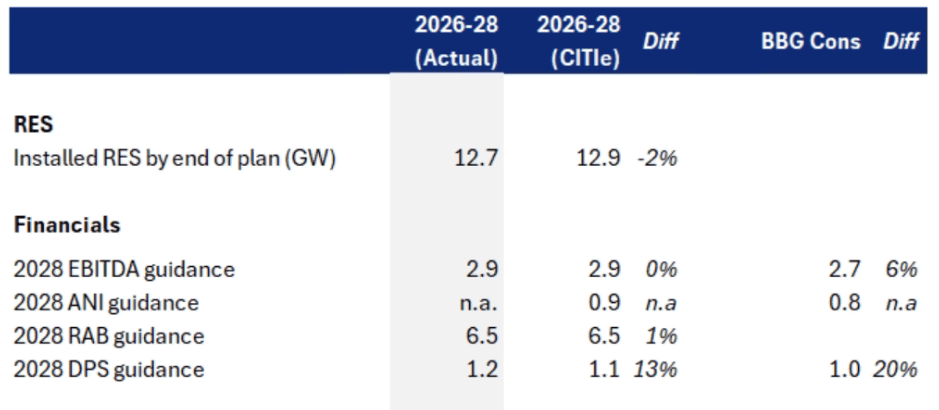 Συγκεκριμένα, η ΔΕΗ στοχεύει σε κεφαλαιακές δαπάνες (CAPEX) ύψους 10,1 δισ. ευρώ (ενώ η εκτίμηση της Citi ήταν 9,5 δισ. ευρώ), στόχος εγκατεστημένων Ανανεώσιμων Πηγών Ενέργειας (ΑΠΕ) 12,7 GW έως το 2028 (εκτίμηση Citi: 12,9 GW) και καθοδήγηση για το EBITDA του 2028 στα 2,9 δισ. ευρώ (σε σύγκριση με τα 2,7 δισ. ευρώ των εκτιμήσεων της αγοράς).