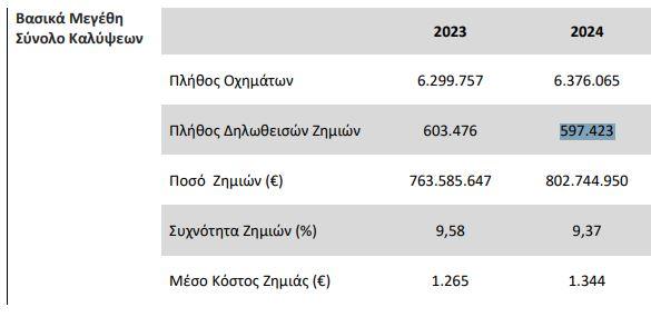 Τα ασφαλισμένα οχήματα το 2024 ήταν 6.376.065 ενώ το πλήθος των δηλωθεισών ζημιών ήταν 597.423 με μέσο κόστος ζημιάς τα 1.344 ευρώ.