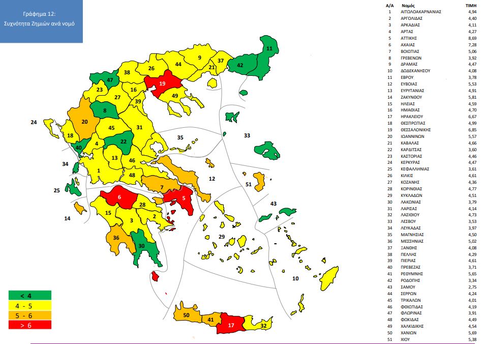 Οι νομοί με τα υψηλότερα ποσοστά στη συχνότητα των ατυχημάτων ήταν η Αττική με 8,69, η Αχαία με 7,28, η Θεσσαλονίκη με 6,85 και το Ηράκλειο Κρήτης με 6,67.