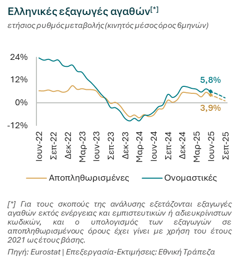 Ωστόσο, το 2025 φαίνεται να εξελίσσεται σε έτος δύο ταχυτήτων, καθώς μετά από αυτή την ισχυρή επίδοση, το 2ο εξάμηνο κινείται σε επίπεδα αντίστοιχα με την περσινή περίοδο. Το μοτίβο αυτό αντανακλά εν πολλοίς τη στρατηγική αποθεματοποίησης από τις εισαγωγικές επιχειρήσεις πριν την ανακοίνωση της εμπορικής συμφωνίας ΕΕ-ΗΠΑ τον Ιούλιο, και την συνεπακόλουθη αντιστροφή της κατά το υπόλοιπο της χρονιάς (με τις υψηλότερες πιέσεις να εκτιμώνται για το 3ο τρίμηνο).