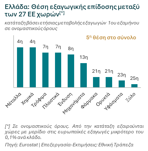Εν μέσω μιας από τις πιο δύσκολες συγκυρίες των τελευταίων δεκαετιών – με δασμούς, ισχυρό ευρώ και γεωπολιτική αβεβαιότητα – οι ελληνικές βιομηχανίες επιδεικνύουν αξιοσημείωτη ανθεκτικότητα, κερδίζοντας έδαφος στις διεθνείς αγορές έναντι των Ευρωπαίων ανταγωνιστών τους. Σύμφωνα με το νέο τεύχος «Τάσεις του Επιχειρείν» της Διεύθυνσης Οικονομικής Ανάλυσης της Εθνικής Τράπεζας οι ελληνικές εξαγωγές αγαθών (εκτός πετρελαίου) αναμένεται να κλείσουν το 2025 με άνοδο 2% σε πραγματικούς όρους, αντιστρέφοντας την πτώση 0,8% του 2024.