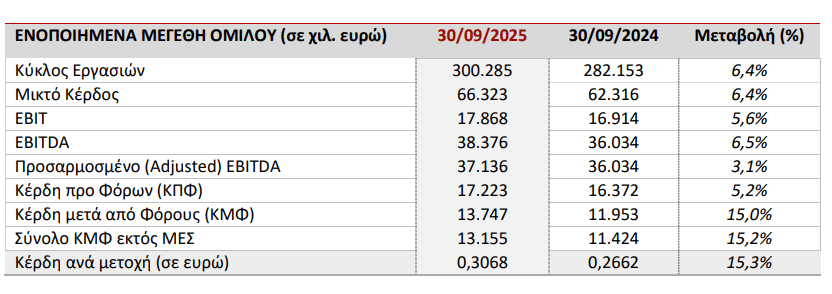 Ειδικότερα, στον πίνακα παρουσιάζονται τα βασικά οικονομικά μεγέθη του Ομίλου για το εννεάμηνο του 2025, σε σχέση με την αντίστοιχη περίοδο του 2024