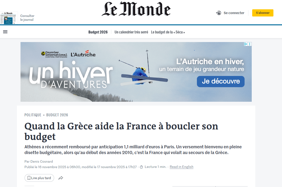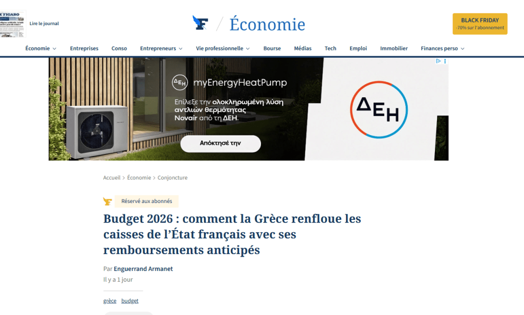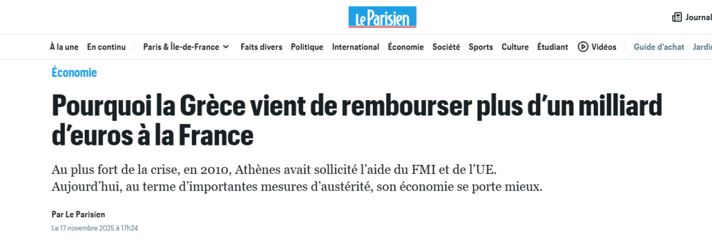 Καθώς η διαδικασία του προϋπολογισμού παρατείνεται και τα μέλη του κοινοβουλίου έχουν μόνο μία εβδομάδα για να εξετάσουν το σχέδιο προϋπολογισμού πριν από την αποστολή του στη Γερουσία, το Υπουργείο Οικονομικών εξακολουθεί να ελπίζει ότι θα διατηρήσει το έλλειμμα του 2025 σε τροχιά ώστε να φτάσει το 4,7% του ΑΕΠ το 2026. […] Αυτό ακριβώς συμβαίνει φέτος, καθώς ένας απροσδόκητος σύμμαχος έχει προσφέρει κάποια ανακούφιση στα οικονομικά της Γαλλίας. Η Ελλάδα, κάποτε σύμβολο του αυξανόμενου δημόσιου χρέους στην Ευρώπη, έχει προβεί σε πρόωρη αποπληρωμή 1,1 δισεκατομμυρίου ευρώ στο Παρίσι. Το ποσό αυτό καλύπτει το κεφάλαιο που αρχικά οφειλόταν μεταξύ 2033 και 2041 στο πλαίσιο των διμερών δανείων που χορηγήθηκαν το 2010 για τη διατήρηση της σταθερότητας της ευρωζώνης.