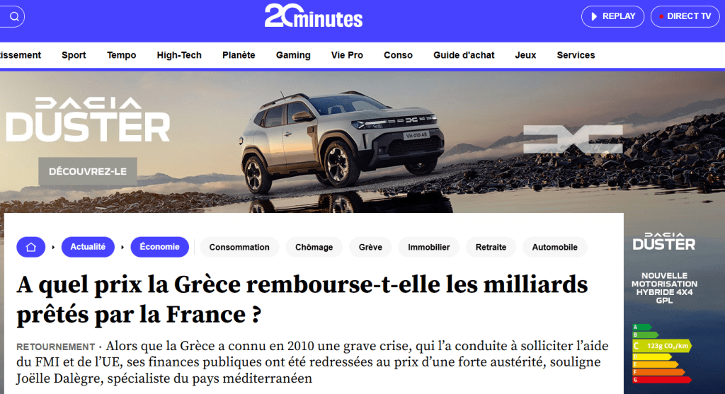 Και συνεχίζει: η προέλευση του γαλλικού δανείου χρονολογείται από το 2010. Στη συνέχεια, στα πρόθυρα της χρεοκοπίας , η Αθήνα προκαλούσε στην Ευρώπη σημαντικό άγχος, και ορισμένοι, όπως η Γερμανία, εξέτασαν ακόμη και την πιθανότητα εξόδου της χώρας από την ευρωζώνη, την οποία απειλούσε να παρασύρει μαζί της. Η Αθήνα τελικά έλαβε δάνειο 274 δισεκατομμυρίων ευρώ από το Διεθνές Νομισματικό Ταμείο (ΔΝΤ) και διάφορες χώρες, συμπεριλαμβανομένης της Γαλλίας, η οποία εκταμίευσε 11,4 δισεκατομμύρια ευρώ μεταξύ 2010 και 2012 – ένα ποσό που τότε κατηγορήθηκε ότι παραλύει τα δημόσια οικονομικά. Σε αντάλλαγμα, η χώρα τέθηκε υπό την εποπτεία της Επιτροπής των Βρυξελλών, της Ευρωπαϊκής Κεντρικής Τράπεζας και του ΔΝΤ, και αναγκάστηκε σε σημαντικές, και όχι λιγότερο επώδυνες, μεταρρυθμίσεις: οι δημόσιοι υπάλληλοι έχασαν περισσότερο από το 40% των μισθών τους, οι συνταξιούχοι σχεδόν το 50% των συντάξεών τους… Ακολούθησαν οκτώ χρόνια ύφεσης, το ΑΕΠ μειώθηκε κατά 25%, το ποσοστό ανεργίας έφτασε το 28%, μέχρι που τα πράγματα βελτιώθηκαν και η χώρα κατάφερε να απελευθερωθεί από την εποπτεία το 2018.