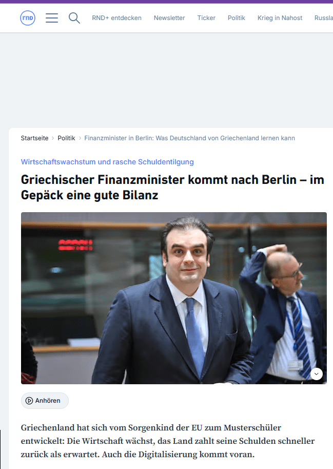 Αυτό γράφει το γερμανικό δημοσιογραφικό δίκτυο RND σε άρθρο του αναφορικά με την επικείμενη επίσκεψη στο Βερολίνο του υπουργού Οικονομικών Κυριάκου Πιερρακάκη και σημειώνει: