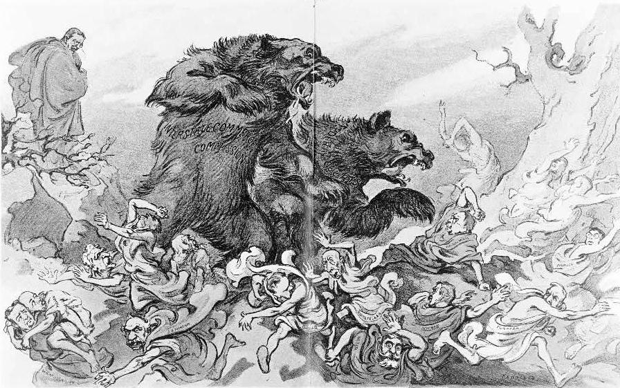 Ο πρόεδρος Θεόδωρος Ρούζβελτ επιτίθεται στην Wall Street με τις αρκούδες του (γελοιογραφία εποχής)