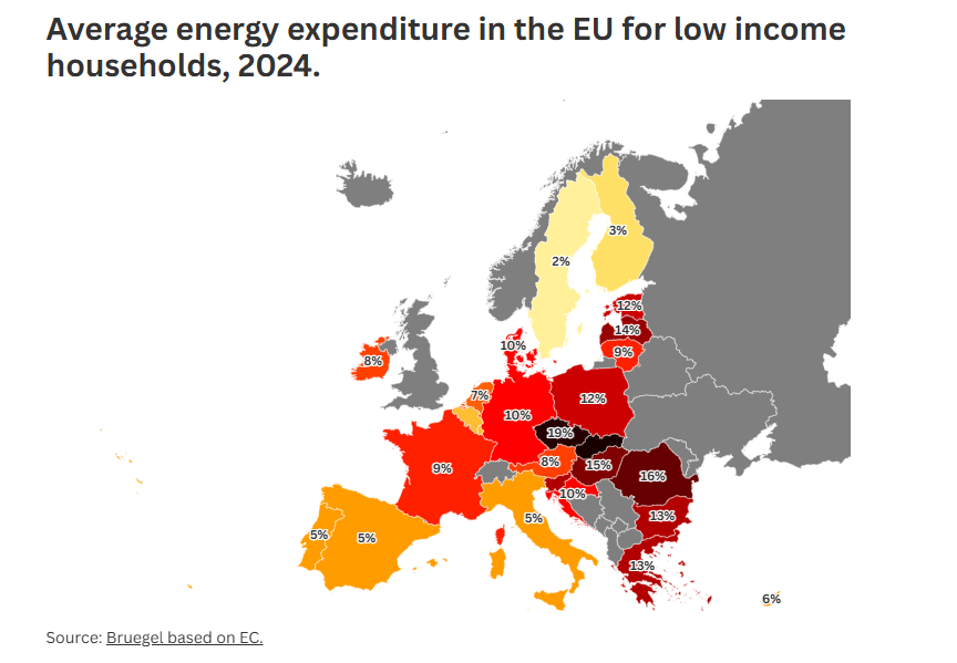 Κατά μέσο όρο σε ολόκληρη την ΕΕ, οι λογαριασμοί ενέργειας αντιπροσωπεύουν το 5% και 9% των δαπανών των νοικοκυριών για οικογένειες χαμηλού και μεσαίου εισοδήματος, αντίστοιχα με τις αγροτικές περιοχές να επωμίζονται το μεγαλύτερο βάρος. Για παράδειγμα, τα αγροτικά νοικοκυριά στην Πολωνία δαπανούν διπλάσιο μέρος του εισοδήματός τους για θέρμανση από τα αστικά νοικοκυριά. To αντίστοιχο ποσοστό στην Ελλάδα για τα νοικοκυριά χαμηλού εισοδήματος ανέρχεται σε 13%
