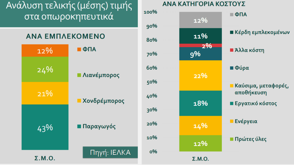 Αναλύοντας την τελική μέση τιμή στα οπωροκηπευτικα διαπιστώνεται πως ως προς τη διαμόρφωσή της η συμμετοχή του παραγωγού ανέρχεται στο 43%, του χονδρεμπόρου στο 21%, των λιανεμπόρων στο 24%, ενώ στο 12% είναι ο ΦΠΑ.