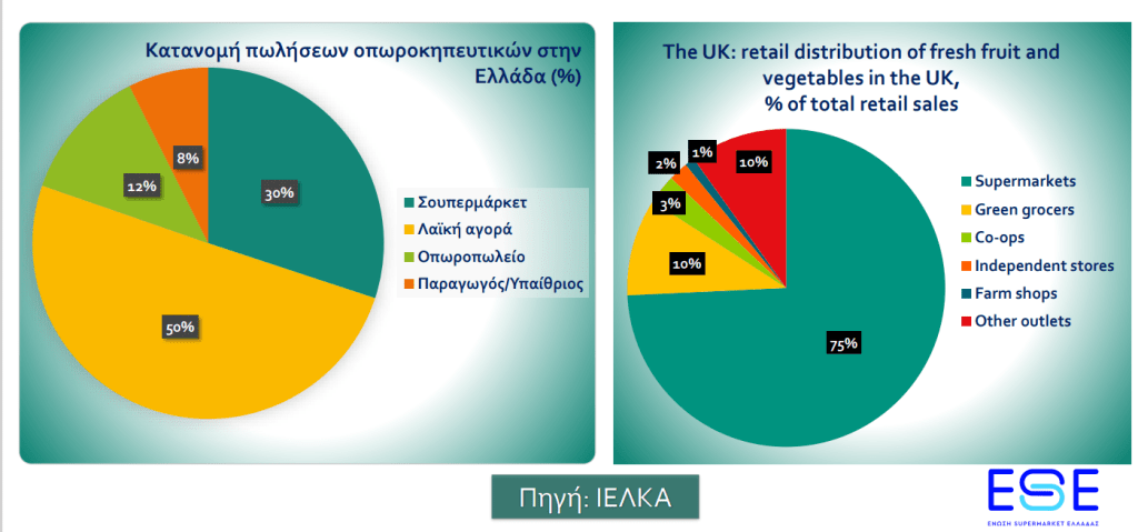 Η εικόνα φαίνεται να είναι πολύ διαφορετική σε σχέση με το εξωτερικό. Το ΙΕΛΚΑ στην έρευνά του συνέκρινε την εγχώρια αγορά με αυτήν του Ηνωμένου Βασιλείου, όπου στις πωλήσεις οπωροκηπευτικών κυριαρχούν τα σούπερ μάρκετ με 75% και το υπόλοιπο ποσοστό μοιράζεται σε άλλες μικροτέρου μεγέθους κατηγορίες καταστημάτων.