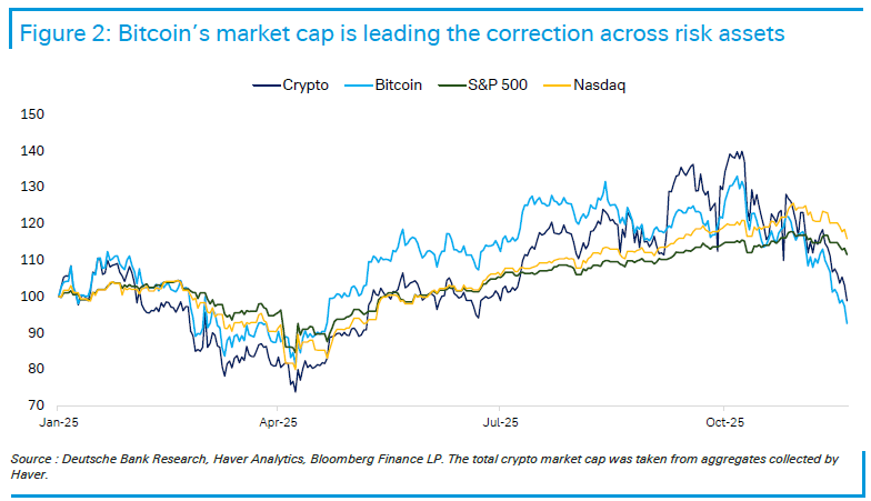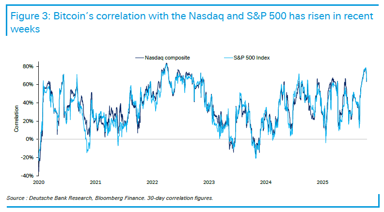 Η πτώση του Bitcoin συνέπεσε με ευρύτερη υποχώρηση των μετοχών και άλλων επενδύσεων υψηλού ρίσκου, καταδεικνύοντας ότι το κρυπτονόμισμα δεν λειτουργεί ακόμη αξιόπιστα ως ασφαλές καταφύγιο, εξηγεί αναλυτικά η Deutsche Bank. Η συσχέτιση με τον Nasdaq 100 φτάνει 46%, ενώ με τον S&P 500 το 42%, επίπεδα αντίστοιχα με την περίοδο του COVID το 2022.