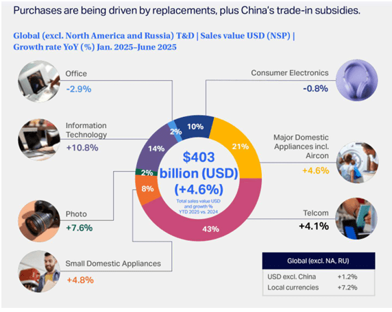 Παρά τις πιέσεις, η παγκόσμια αγορά Τεχνολογίας και Διαρκών Καταναλωτικών Αγαθών (T&D) έκλεισε το πρώτο εξάμηνο του 2025 με άνοδο 4,6%, φτάνοντας τα 403 δισ. δολάρια.