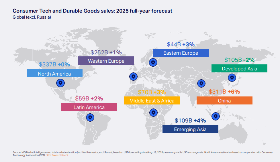 Η Nielsen προβλέπει ότι το 2026 οι μικροσυσκευές θα καταγράψουν άνοδο 4% έως 6%, ενώ οι μεγάλες συσκευές θα αυξηθούν 3% έως 5% στη Λατινική Αμερική. Η ευρωπαϊκή αγορά θα κινηθεί ήπια, με αύξηση περίπου 1%, ενώ η Κίνα θα συνεχίσει την ανοδική της πορεία με ρυθμούς 4% έως 7%.