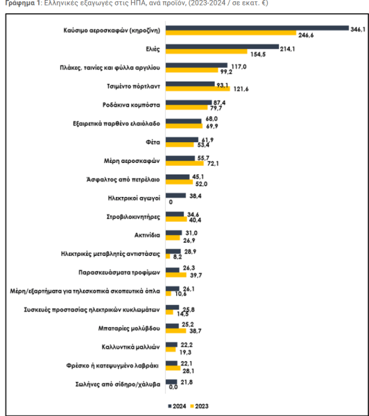 Η συνδυαστική αποτύπωση τόσο σε ετήσια βάση (2023–2024), όσο και συγκριτικά για το διάστημα πριν και μετά την επιβολή των δασμών (Απρίλιος–Σεπτέμβριος 2024–2025), ανέδειξε ελληνικά προϊόντα να εμφανίζονται για πρώτη φορά στην αγορά, υποδηλώνοντας διεύρυνση της εξαγωγικής βάσης ακόμη και εν μέσω δασμών.