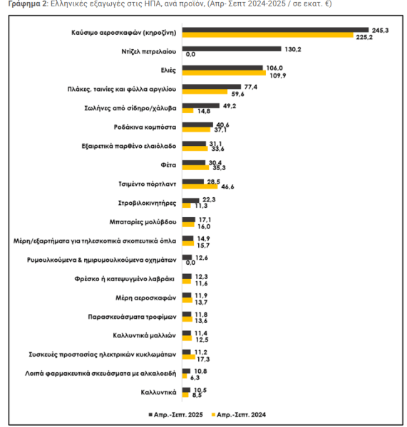 Ανάλογη πορεία είχαν τα ροδάκινα κομπόστα (+9,4% την περίοδο Απρ.–Σεπτ. 2025 σε σχέση με την αντίστοιχη περίοδο του 2024), τα φαρμακευτικά σκευάσματα με αλκαλοειδή (HS 30049000) (+71,2%), οι στροβιλοκινητήρες (HS 84111230) (+97,4%) και το καύσιμο αεροσκαφών (HS 27101921) (+8,9%).