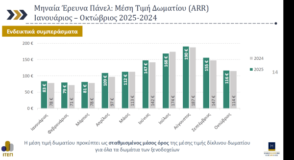 Η υψηλότερη μέση τιμή (190 ευρώ) καταγράφηκε τον Αύγουστο, ενώ η χαμηλότερη (79 ευρώ) καταγράφηκε τον Φεβρουάριο. Όπως προαναφέρθηκε, όλοι οι μήνες ήταν καλύτεροι, εκτός από τον Ιούλιο, κατά τον οποίο η μέση τιμή δωματίου φέτος μειώθηκε στα 168 ευρώ έναντι 174 ευρώ τον ίδιο μήνα του 2024. Ειδικά τον Οκτώβριο, έναν μήνα «θερμό» ακόμη για τον ελληνικό τουρισμό, η μέση τιμή διάθεσης του δίκλινου δωματίου ήταν στα 116 ευρώ έναντι 114 ευρώ τον ίδιο μήνα του 2024.