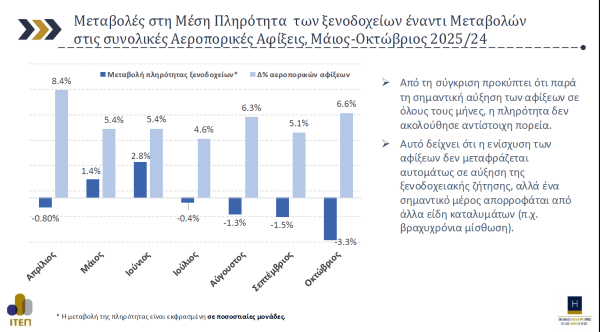 Από τη σύγκριση προκύπτει ότι, παρά τη σημαντική αύξηση των αφίξεων σε όλους τους μήνες, η πληρότητα δεν ακολούθησε αντίστοιχη πορεία. Αυτό δείχνει ότι η ενίσχυση των αφίξεων δεν μεταφράζεται αυτομάτως σε αύξηση της ξενοδοχειακής ζήτησης, αλλά ένα σημαντικό μέρος απορροφάται από άλλα είδη καταλυμάτων (π.χ. βραχυχρόνια μίσθωση), αναφέρει το ΙΤΕΠ.