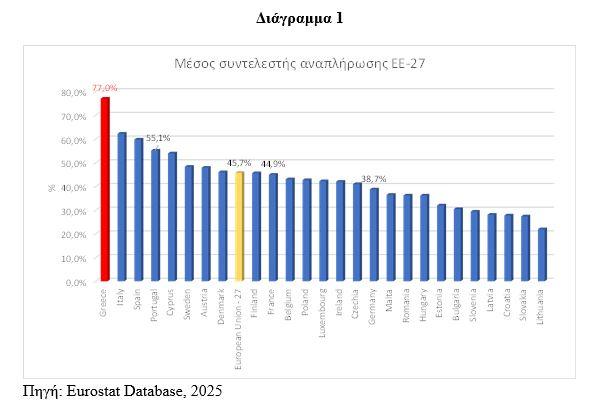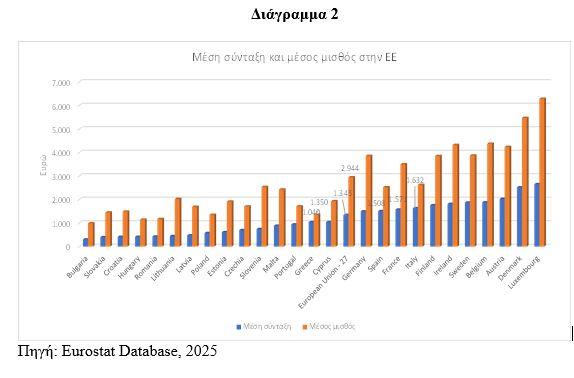 Κατά συνέπεια εφόσον, κατά την θεώρηση αυτή, το σύστημα κοινωνικής ασφάλισης στην χώρα μας είναι γενναιόδωρο και μακροχρόνια μη βιώσιμο εκτιμάται ότι θα προκαλέσει σημαντική επιβάρυνση στον κρατικό προϋπολογισμό, δεδομένου και της αρνητικής μεταβολής της αναλογίας εργαζομένων προς συνταξιούχους από 2,03 το 2025 σε 1,49 το 2070 λόγω της δημογραφικής γήρανσης. Όμως «το παράδοξο» με το συνταξιοδοτικό σύστημα της χώρας μας είναι ότι ενώ έχει τον μεγαλύτερο συντελεστή αναπλήρωσης(77%) (Διάγραμμα 1) και την 4η υψηλότερη συνταξιοδοτική δαπάνη (13,9% του ΑΕΠ) (12,7% μέσος όρος των Ε.Ε.-27), το ποσό της μέσης σύνταξης είναι μικρότερο από τον μέσο όρο της Ε.Ε.-27, υπερβαίνοντας μόνο τις βαλκανικές χώρες και τα ανατολικά κράτη-μέλη της Ευρωπαϊκής Ένωσης (Διάγραμμα 2).