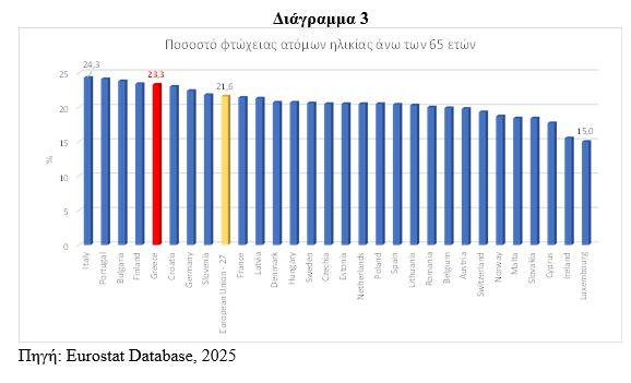 «Το παράδοξο» αυτό συνεχίζει να αντικατοπτρίζεται και στο γεγονός ότι η Ελλάδα παρουσιάζει από τα υψηλότερα ποσοστά φτώχειας του πληθυσμού άνω των 65 ετών στην Ε.Ε.-27 (Διάγραμμα 3).