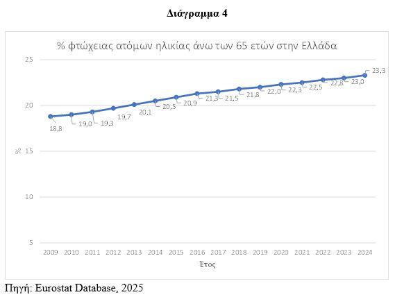 Όμως ακόμα πιο «παράδοξο» είναι το γεγονός ότι ενώ η συνταξιοδοτική δαπάνη έχει αυξηθεί από το 2021 μέχρι το 2024 κατά 11,4%, από τα 29,6 δις ευρώ(2021) σε 33 δις ευρώ(2024), αναμένοντας να διαμορφωθεί σε 34,3 δις το 2025, το ποσοστό φτώχειας των ατόμων ηλικίας άνω των 65 ετών, σύμφωνα με τα στοιχεία της Eurostat, αυξήθηκε από 22,5% το 2021 σε 23,3% το 2024. Ποσοστό το οποίο είναι κατά 13,6% αυξημένο ακόμα και από αυτό της περιόδου 2013-2018 που κυμαίνονταν σε 20,5% (Διάγραμμα 4).