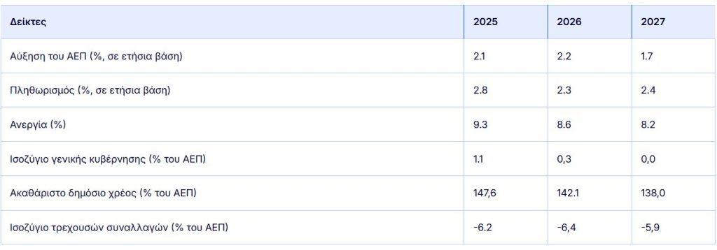 Υπενθυμίζεται ότι η Επιτροπή στις φθινοπωρινές οικονομικές προβλέψεις της για την Ελλάδα εκτιμά ότι η οικονομία της χώρας μας αναμένεται να συνεχίσει να αναπτύσσεται με ισχυρό ρυθμό, με προβλεπόμενη ανάπτυξη 2,1% το 2025 και 2,2% το 2026, υποστηριζόμενη από σταθερή κατανάλωση και επενδύσεις που υποστηρίζονται από κονδύλια της ΕΕ. Η αύξηση του ΑΕΠ προβλέπεται να μετριαστεί στο 1,7% το 2027, καθώς το RRF πλησιάζει στο τέλος του. Ο πληθωρισμός αναμένεται να μειωθεί σταδιακά, στο 2,4% έως το 2027, καθώς η ισχυρή ζήτηση και η προβλεπόμενη αύξηση των τιμών της ενέργειας θα ασκήσουν ανοδική πίεση στις τιμές καταναλωτή. Η ανεργία μειώνεται σε επίπεδα που δεν έχουν παρατηρηθεί εδώ και περισσότερο από μια δεκαετία, αλλά εξακολουθούν να υπάρχουν διαρθρωτικές προκλήσεις. Οι δημοσιονομικές προοπτικές της Ελλάδας παραμένουν ευνοϊκές για την περίοδο 2025-27, με γενικά σταθερά πρωτογενή πλεονάσματα, παρά τις φορολογικές περικοπές και τα κοινωνικά μέτρα. Η ισχυρή ονομαστική αύξηση του ΑΕΠ και τα πλεονάσματα του προϋπολογισμού αναμένεται να διατηρήσουν τον λόγο χρέους προς ΑΕΠ σε πτωτική τάση, κινούμενος κάτω από το 140% έως το 2027.