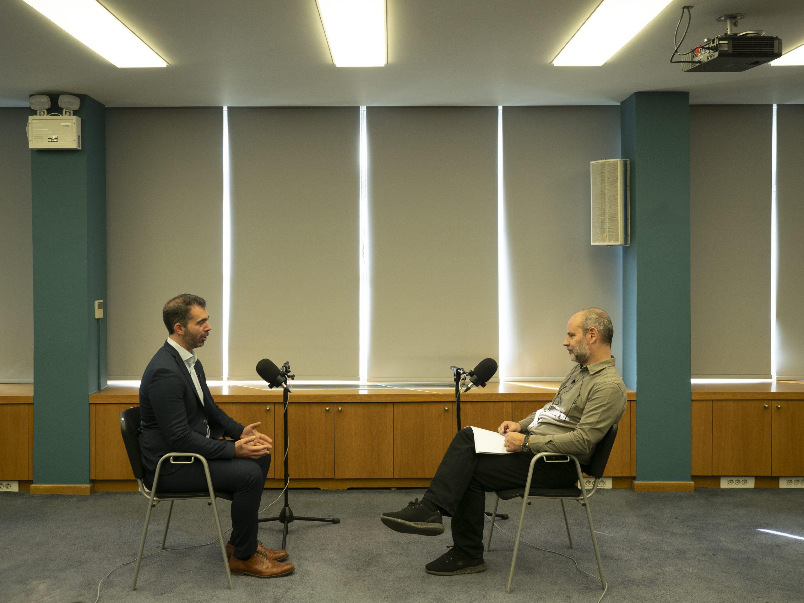 Ο δημοσιογράφος του ΟΤ Γιάννης Αγουρίδης με τον Επίκουρο Καθηγητή Δημόσιας Οικονομικής στο Πανεπιστήμιο Κρήτης και πρώην επικεφαλής του Γραφείου Προϋπολογισμού της Βουλής Φραγκίσκο Κουτεντάκη