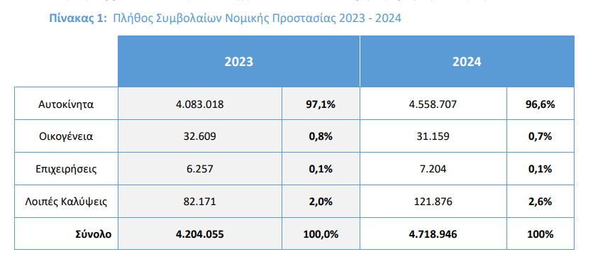 Σε 4.718.946 από 4.204.055 το 2023, ανήλθαν τα συμβόλαια νομικής προστασίας το 2024, αλλά σύμφωνα με όσα αναφέρει ηΈνωση Ασφαλιστικών Εταιρειών Ελλάδας (ΕΑΕΕ), με αφορμή την ολοκλήρωση σχετικής της έρευνας «η συμμετοχή στην έρευνα του 2023 προήλθε από μικρότερο δείγμα επιχειρήσεων, γεγονός που καθιστά μη συγκρίσιμα τα απόλυτα μεγέθη των δύο ετών».