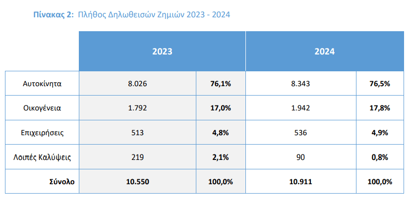Αντίστοιχα, το 2023 είχαν δηλωθεί 10.550 ζημιές, με ποσό αποζημίωσης 0,57 εκατ. ευρώ και απόθεμα εκκρεμών ζημιών ύψους 1,9 εκατ. ευρώ.