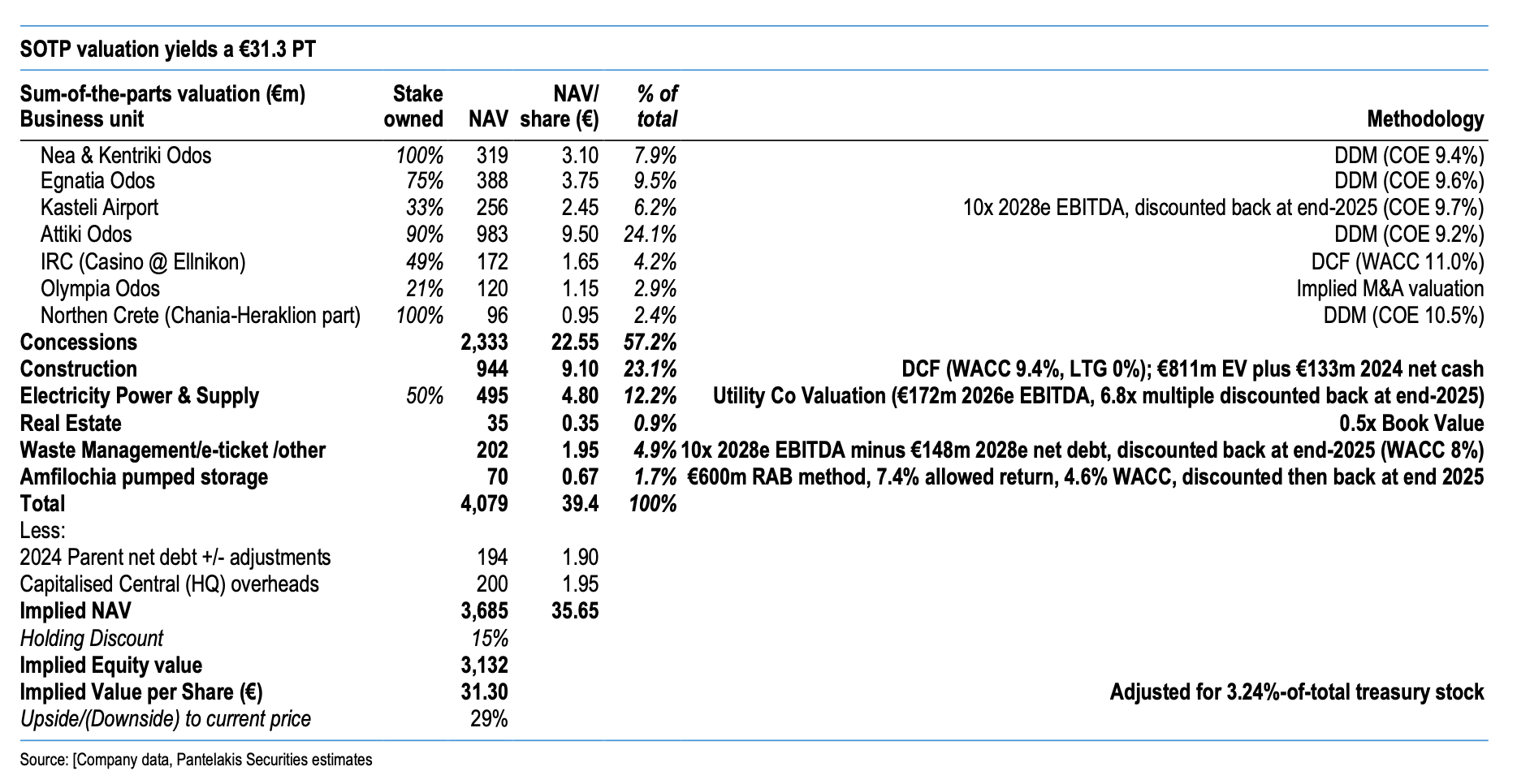 Για την χρηματιστηριακή εταιρεία, η αγορά δεν έχει ακόμη αποτιμήσει επαρκώς, το γεγονός ότι η μητρική εταιρεία θα διατηρήσει από το 2030 και μετά, καθαρή θέση χωρίς δανεισμό και θα μπορεί να χρηματοδοτεί έως €1,6 δισ. νέων έργων ετησίως με μόλις €0,3 δισ. ίδια κεφάλαια, ενισχύοντας τα περιθώρια ανάπτυξης, ενώ με δεδομένη τη σταθερότητα των παραχωρήσεων, την εκρηκτική αύξηση των μερισμάτων και το ενισχυμένο χαρτοφυλάκιο έργων, η τρέχουσα αποτίμηση δεν αντικατοπτρίζει την πραγματική αξία της εταιρείας.