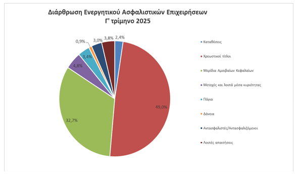 Η αξία των συνολικών τοποθετήσεων των ασφαλιστικών επιχειρήσεων σε χρεωστικούς τίτλους αυξήθηκε στα 10.719 εκατ. ευρώ στο τέλος του γ΄ τριμήνου του 2025, έναντι 10.621 εκατ. ευρώ το προηγούμενο τρίμηνο, εξέλιξη που οφείλεται κυρίως σε καθαρές αγορές ομολόγων του εξωτερικού. Το ποσοστό των χρεωστικών τίτλων επί του συνολικού ενεργητικού μειώθηκε στο 49,0% το γ΄ τρίμηνο του 2025, έναντι 49,4% το προηγούμενο τρίμηνο.