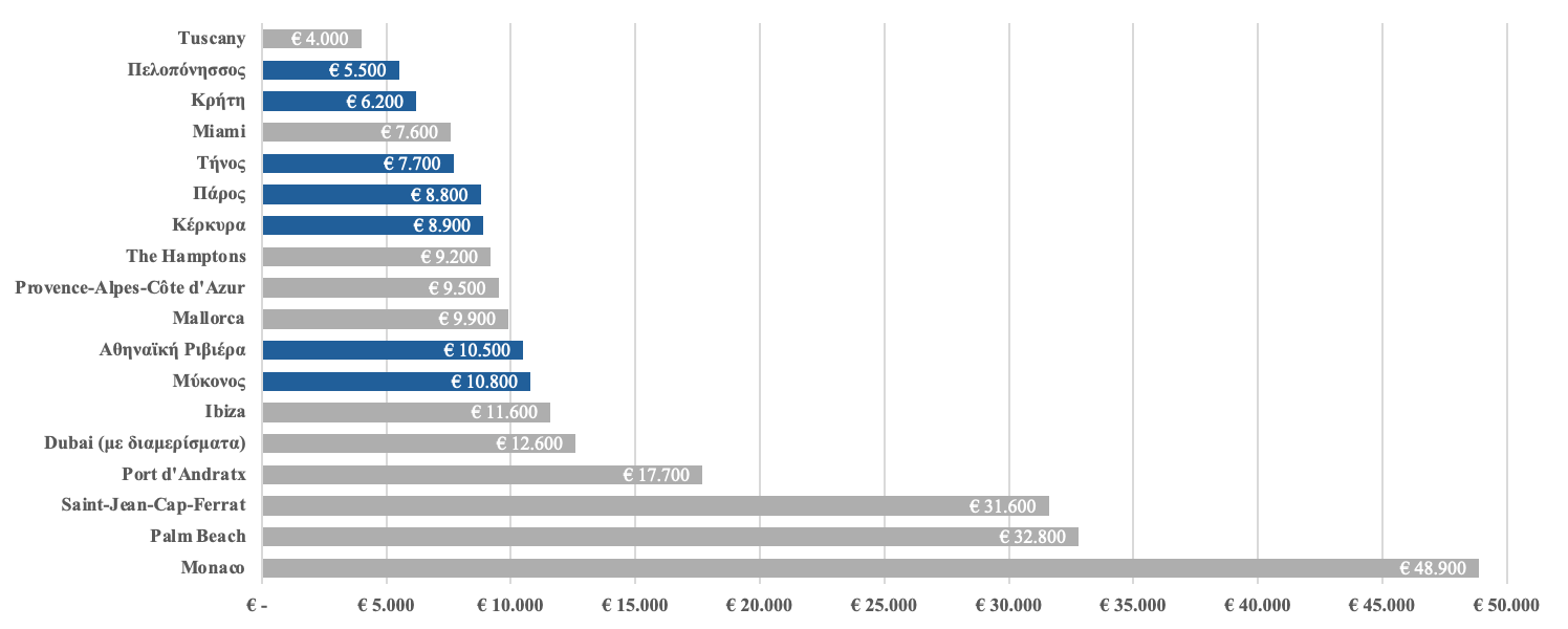 Η Αθηναϊκή Ριβιέρα με 10.500 ευρώ το τετραγωνικό πλησιάζει το Ντουμπάι (12.600 ευρώ/τ.μ.). Στις διεθνείς συγκρίσεις πέραν της Μεσογείου, η Τήνος (7.700 ευρώ/τ.μ.) και η Πάρος (8.800/τ.μ.) κινούνται υψηλότερα από το Μαϊάμι (7.600 ευρώ/τ.μ.), ενώ τα Hamptons (9.200 ευρώ/τ.μ.) βρίσκονται πια σε απόσταση αναπνοής από δημοφιλείς ελληνικούς προορισμούς.
