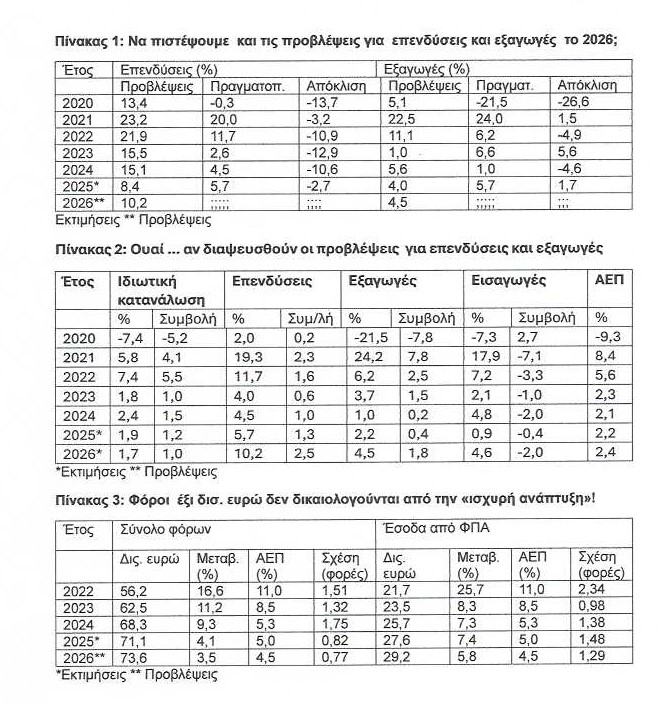 Συμπληρώνω τις παραπάνω διαπιστώσεις του Ελεγκτικού Συνεδρίου με εκείνες που προκύπτουν από τον παρατιθέμενο πίνακα 3: Η περιβόητη και συνεχώς θρυλλούμενη «σημαντικότερη φορολογική μεταρρύθμιση της Μεταπολίτευσης », με ενίσχυση του εισοδήματος κι άλλα τέτοια ηχηρά, δεν τεκμηριώνεται από τη σχέση μεταβολής των συνολικών φόρων και του ΦΠΑ και μεταβολής του ονομαστικού ΑΕΠ, καθώς πάνω από έξι δις. ευρώ δεν δικαιολογούνται από την ανάπτυξη, ούτε φυσικά από τις «μεταρρυθμίσεις» για την «πάταξη» της φοροδιαφυγής. Μάλιστα, και για το 2026 (αν ποτέ επαληθευθούν οι προβλέψεις!) προκύπτει ότι τα έσοδα από ΦΠΑ θα είναι μιάμιση περίπου φορές από τη μεταβολή του ΑΕΠ. Ύστερα, όλα αυτά συμβάλλουν στην υπερβάλλουσα ζήτηση, η οποία, υπάρχοντος του παραγωγικού κενού, διατηρεί και ενισχύει τις μόνιμες πληθωριστικές πιέσεις! Επίσης, το επίμονο «αφήγημα» για ρυθμό ανάπτυξης υψηλότερο από τον αντίστοιχο στην Ευρωζώνη είναι «αέρας κοπανιστός φούσκας» , που τον καταλαβαίνεις βλέποντας τον πίνακα με τον κατά κεφαλήν ΑΕΠ σε μονάδες αγοραστικής δύναμης των Ελλήνων που είναι στο τέλος μαζί με τη Βουλγαρία!