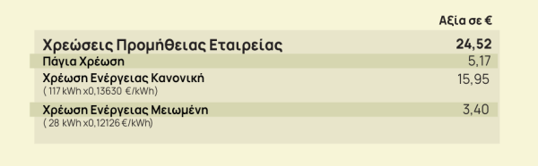 1.       Το πρώτο είναι οι «Χρεώσεις Προμήθειας Εταιρείας». Σε αυτό περιλαμβάνονται οι χρεώσεις για την κατανάλωση ηλεκτρικής ενέργειας. Αφορούν μόνο την αξία του ρεύματος. Τιμολογείται η κατανάλωση ηλεκτρικής ενέργειας «χρέωση ενέργειας κανονική» και η κατανάλωση ρεύματος κατά τις ώρες της χαμηλότερης τιμολόγησης (νυχτερινό). Επισημαίνεται ως «Χρέωση Ενέργειας Μειωμένη». Επίσης περιλαμβάνει και την πάγια χρέωση.