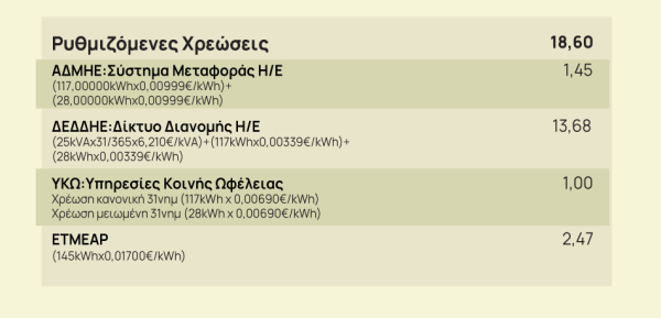 Οι ρυθμιζόμενες χρεώσεις κοστολογούνται σε 18,60 ευρώ ήτοι το 27,8% του τελικού ποσού.